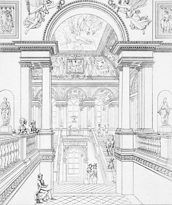 Visitors ascended the Grand Escalier (designed by Percier and Fontaine, both Prix de Rome laureates and architects of the Arc de Triomphe du Carrousel) which led directly to the reception room. Initially drafty, with exposed wooden beams, the salon was soon richly furnished with Beauvais tapestries and objects from the Louvre’s collections; the ceiling was concealed beneath a light plastered wooden structure.