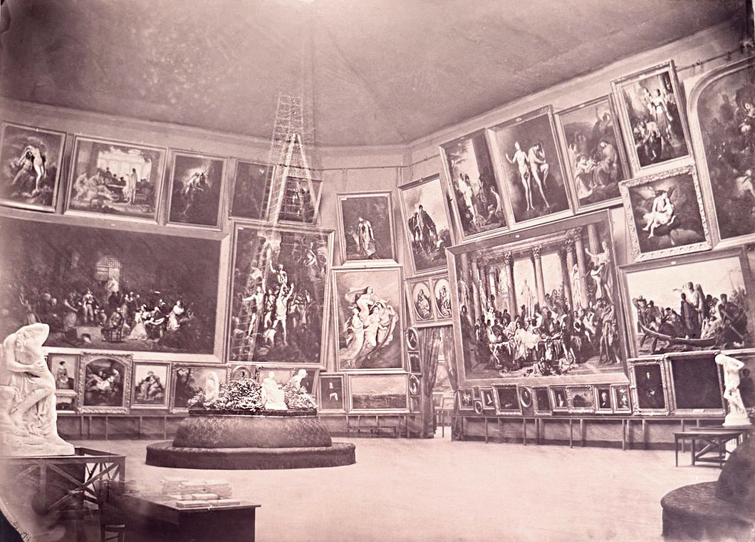 Artists referred to these spaces as chambres mortes (“chambers of the dead”). The galerie sombre, in the right-hand wing, extended from two rooms containing Austrian and Italian sculpture. Lacking a skylight, it relied on dim light from high windows on one side, creating a perpetual twilight.