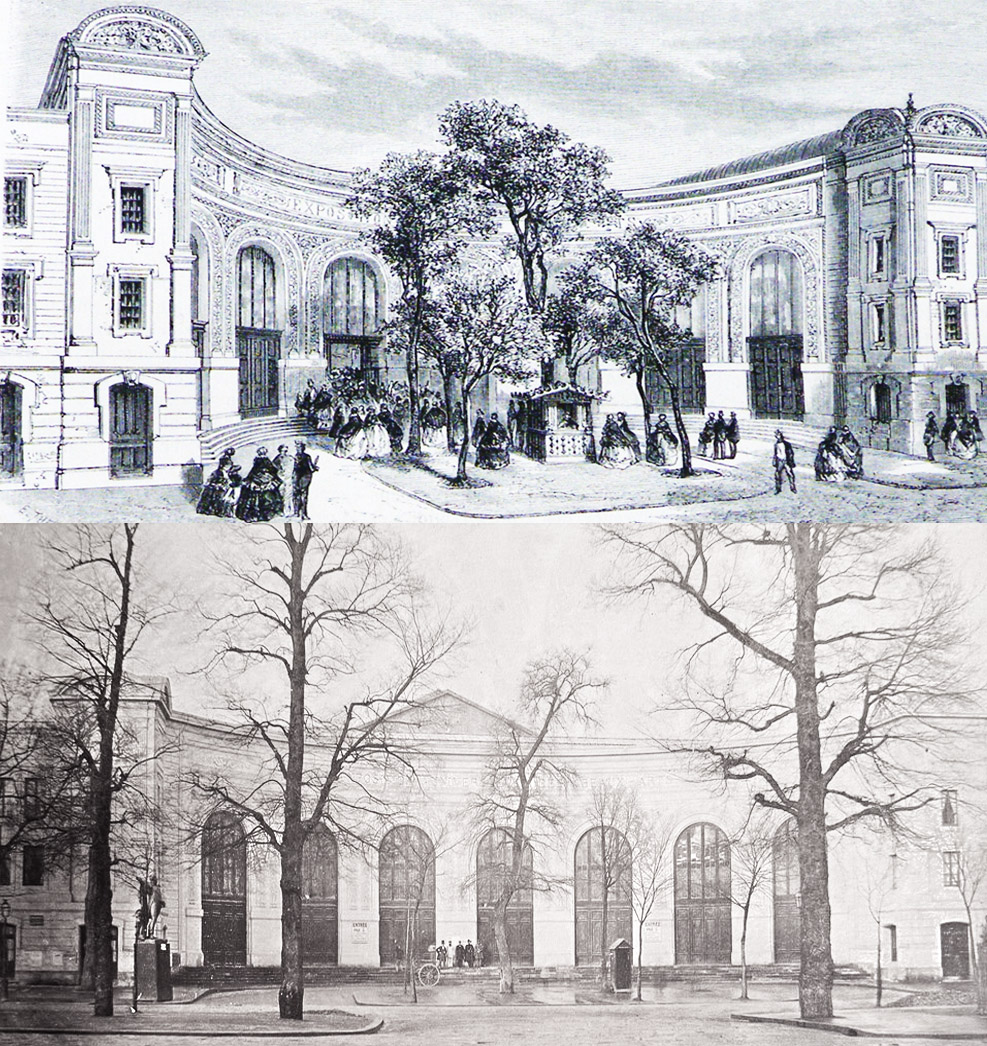 Note: The 1855 Universal Exposition appointed Disdéri as official photographer. Up to that time, engravings were the only medium available for presentation of art works. Photography added a new dimension. The image above shows an engraving of the entrance of the Salon, and Disdéri's photograph. The first provides an attractive artistic perspective, with detailed facade and a kiosk, while the photograph (probably taken towards the end of 1855) provides a much less grand perspective.