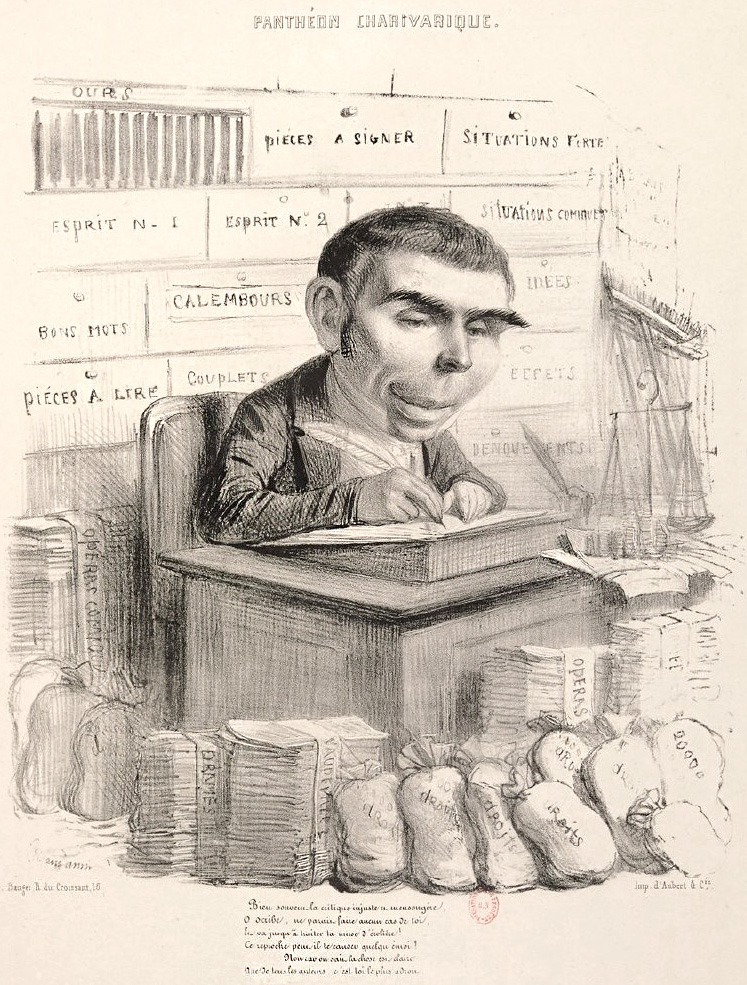 Scribe organized his output with rigorous discipline and relied on a network of credited collaborators who specialized in specific elements such as comic domestic scenes, spoken dialogue, versified couplets, and theatrical effects, as satirically illustrated in the Pantheon Charivarique (1839).