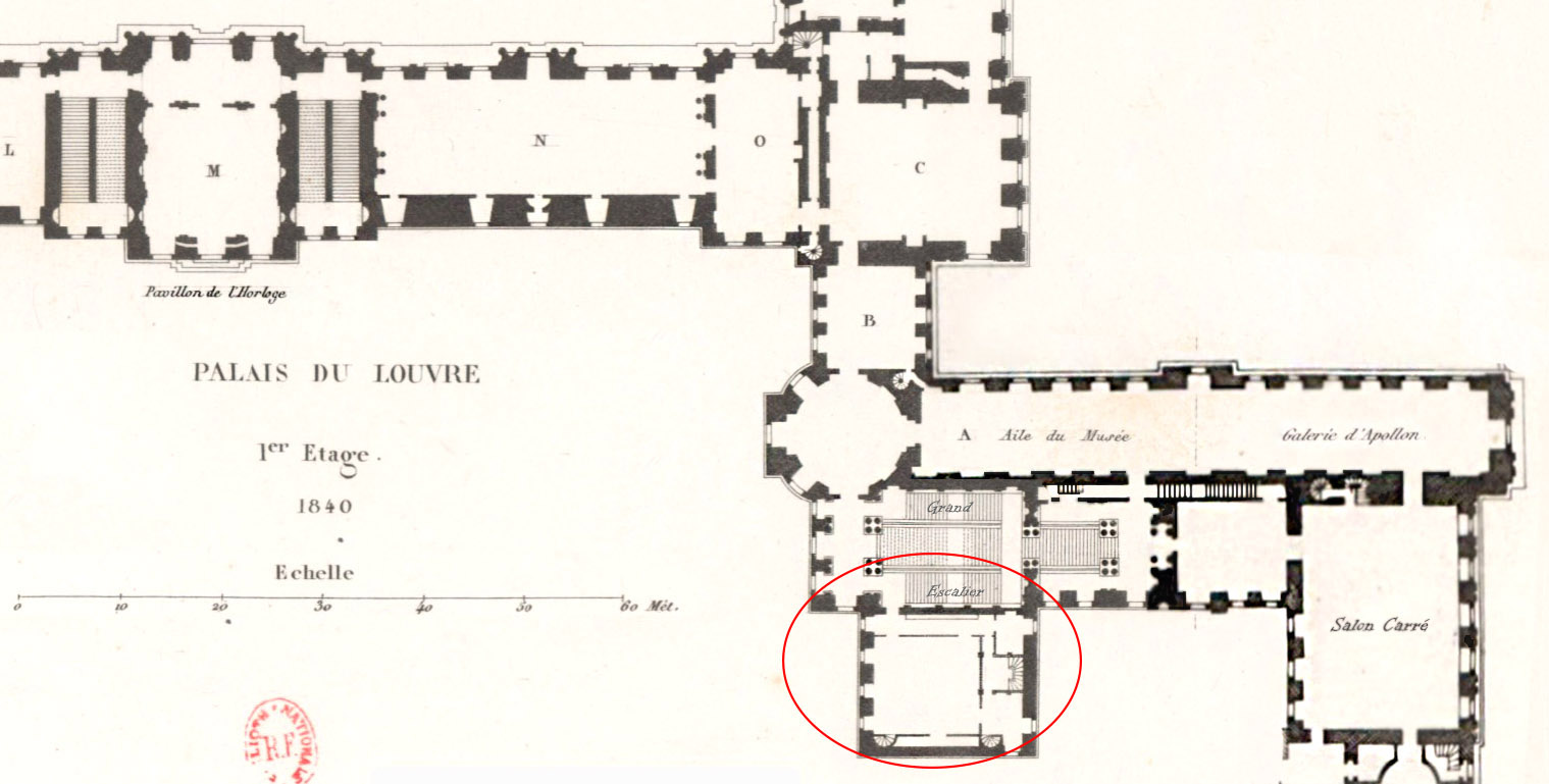 This gallery, renovated by Visconti09 and Duban60 and adorned with paintings by Delacroix10 and Müller18, The major redesign of the Louvre between 1852 and 1857 extended the complex toward the Tuileries (today the location of the Mona Lisa) but also eliminated the original soirée salon, its staircases, and the associated apartments. The Grand Escalier was demolished in 1854 and replaced by the Daru staircase, now crowned by the Winged Victory of Samothrace. When I visited and studied this area in 2020, it became clear that Une Soirée au Louvre constitutes the only visual record of these remarkable gatherings in that part of the palace. Both the Friday-soirées and de Nieuwerkerke’s residence were subsequently relocated to the second floor of the Marengo Pavilion.