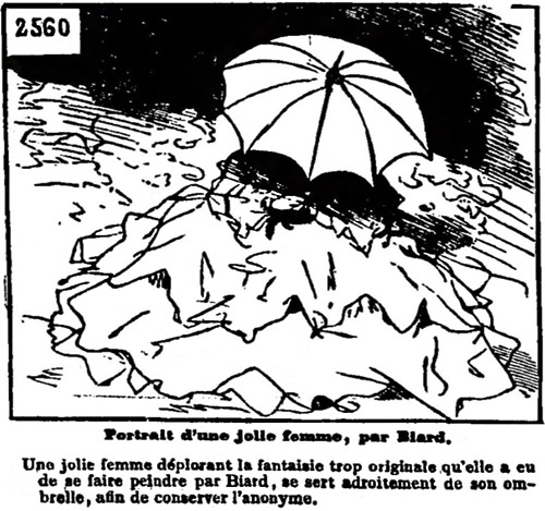 “A lovely lady, lamenting the overly original idea she had of being painted by Biard, deftly deploys her parasol to keep her identity hidden.”