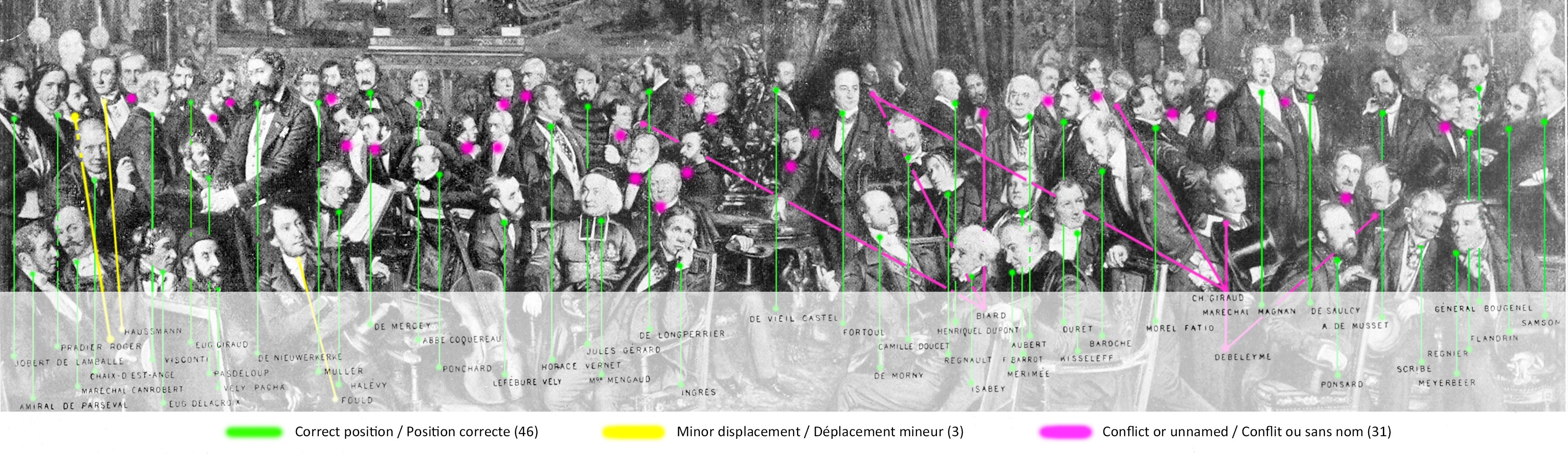 Besides three minor name placement errors (for Roger04a, Haussmann07, Fould17) there are three unclear placements (Biard, Ch. Giraud, de Belleyme), that I discuss in their profile pages (see also image below). It remains unclear why Firmin Rainbeaux wasn't able to identify more of these 80 persons, including well-known ones like Chennevières20, Rousseau64, Reiset65, and Eugène Isabey75.